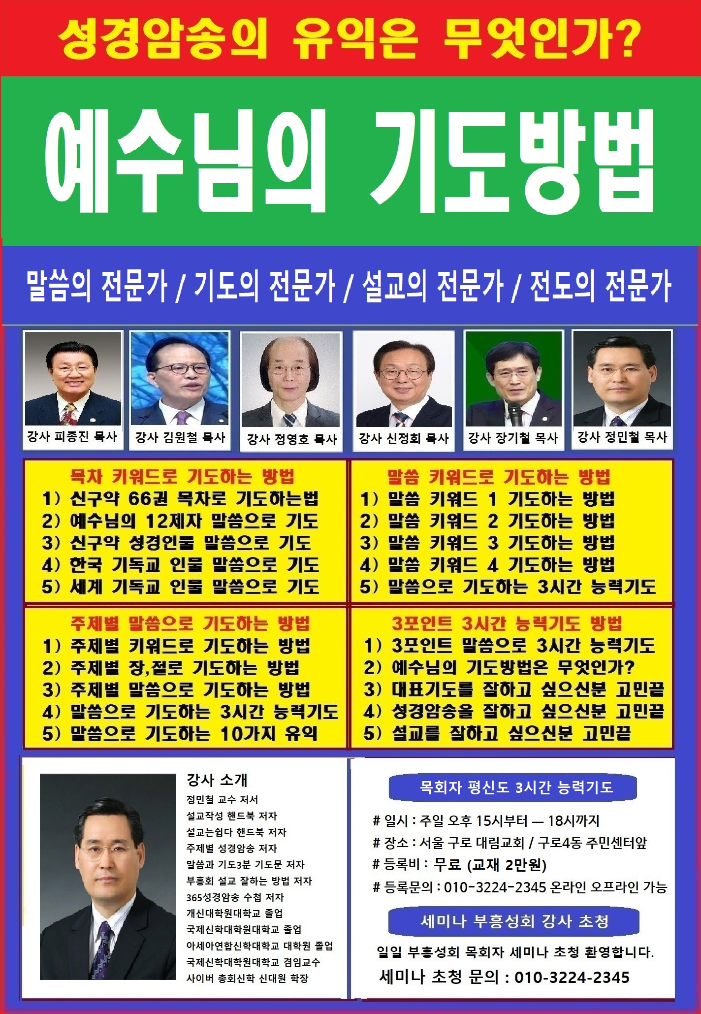요한복음 1:1 태초에 말씀이 계시니라 이 말씀이 하나님과 함께 계셨으니 이 말씀은 곧 하나님 이시니라 성경에는 분명히 말씀이 하나님 이시니라 기록하고 있지만 오늘날 수많은 크리스천들은 말씀에서 하나님을 찾지 못하고 바람 부는대로 물결 치는대로 체험적 믿음생활을 하고 있다. 그러므로 금번 말씀으로 기도하는 3시간 능력기도 세미나를 개최 하오니 기도를 오랫동안 하고 싶지만 그렇지 못한분 마음이 답답하고 평안이 없는분 우울하고 불면증으로 고생 하신분 각종 질병으로 고통에 있는분 설교 방법을 몰라서 고민 하신분, 설교작성 때문에 고민 하신분, 강단에서 원고를 보지않고 설교 하실분, 즉흥 설교작성 3분에 하실분, 금번 세미나를 통하여 기도의 문이 열리고 설교의 맥이 뻥 뚫릴 것이다.
