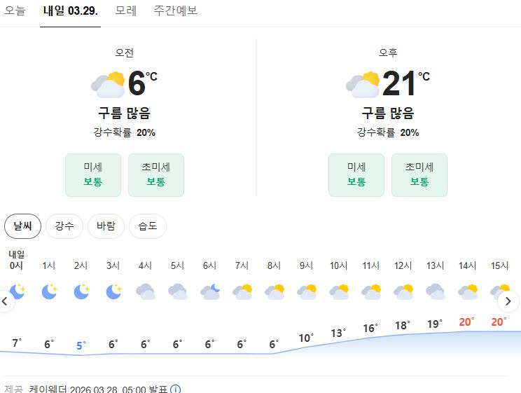 내일 날씨는6~20도 정도 이며 흐린 날씨로 예보가 되며
