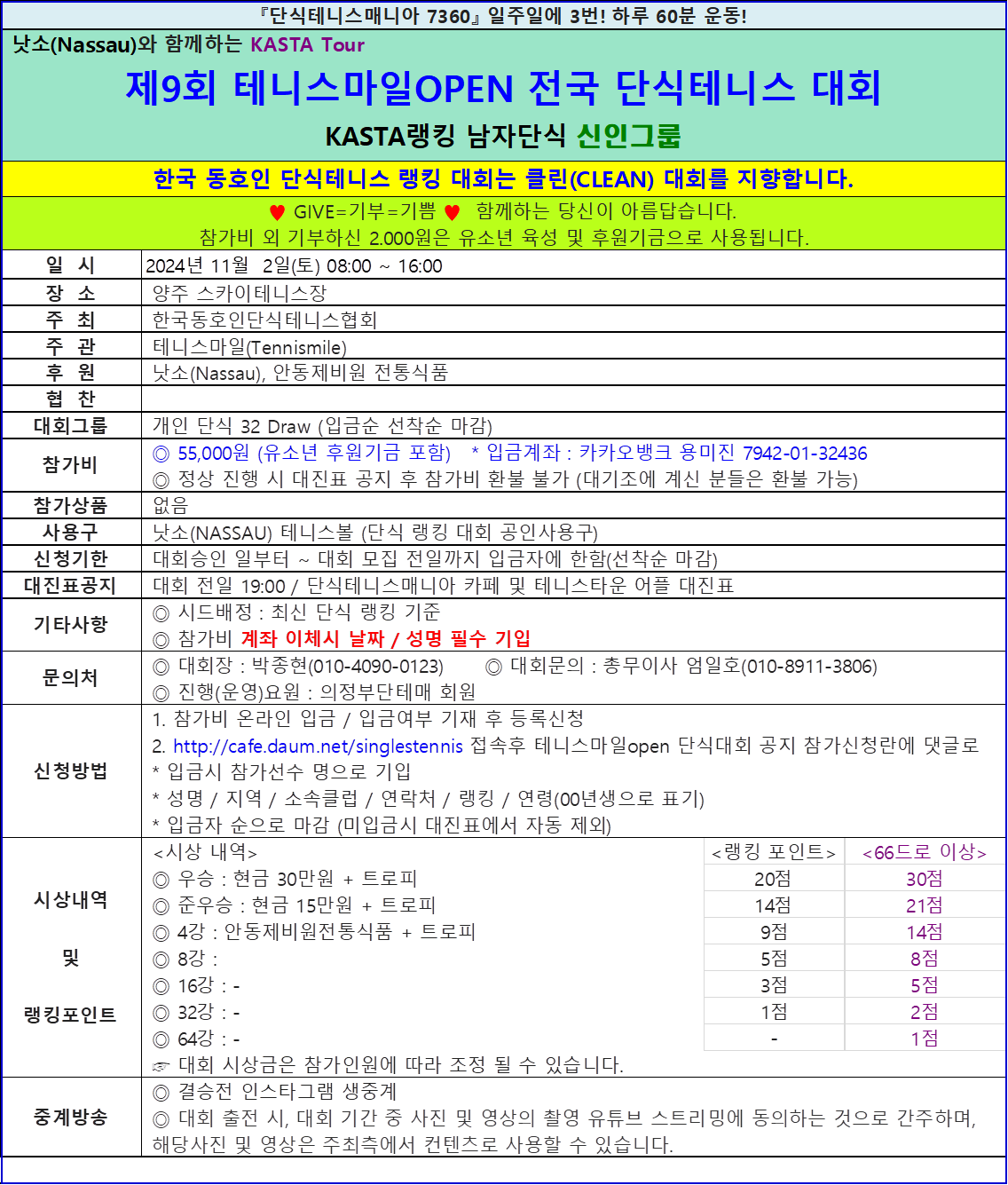 제9회 테니스마일 오픈 남자단식 신인그룹(24.11월 2일 토요일)32드로 작성자박종현님|작성시간24.10.01|조회수488 목록 댓글 1 글자크기 작게가 글자크기 크게가 다음검색 현재 게시글 추가 기능 열기 북마크 신고 센터로 신고 댓글 댓글 1 댓글쓰기 답글쓰기 댓글 리스트 해당 댓글은 작성자와 운영진만 볼 수 있습니다. 댓글 전체보기