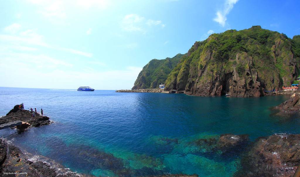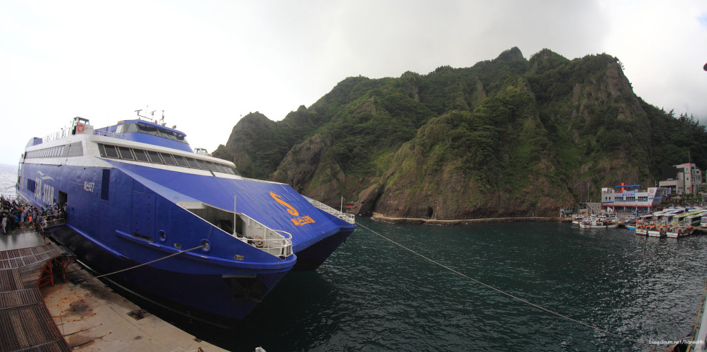 묵호항을출발한고속페리호가 4시간만에도착한 울릉도 도동항