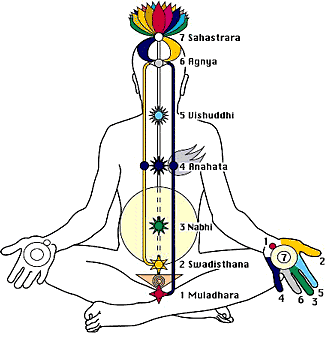 각각의 차크라는 아랫부분부터 무라다라 차크라(muladhara chakra), 스바디스나타 차크라(svadhishana chakra),마니푸라 차크라(manipura chakra), 아나하타 차크라(anahata chakra), 비슈다 차크라(vishudda chakra), 아즈나 차크라(ajna chakra), 사하스라라 차크라(sahasrara chakra)이다. 이들은 위치와 특징에 따라 각기 다른 장기와 신경계와 연관되어 있어 감정을 주관한다.제 1차크라에서 깨어난 쿤달리니는 각 단계별로 에너지 변화를 통해 상승한다. 각각의 단계를 지날 때마다 육체와 감정은 큰 변화를 겪게 된다. 차크라는 자신의 몸 안에 흐르는 에너지를 느끼면서부터 인식되고, 육체뿐 아니라 정신적인 측면에서 차크라의 경험은 자신의 본성과 내재되어 있는 능력을 발견할 수 있도록 이끌어 준다. 눈에 보이는 육체 너머의 그 무엇을 느끼고 인식하게 됨으로써 그것을 활용할 수 있게 되는 것이다.인체에 깃든 우주의 원리