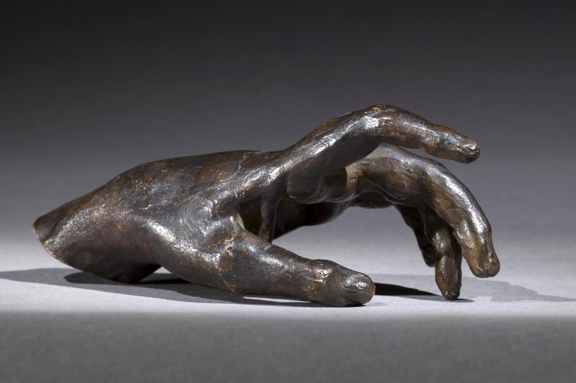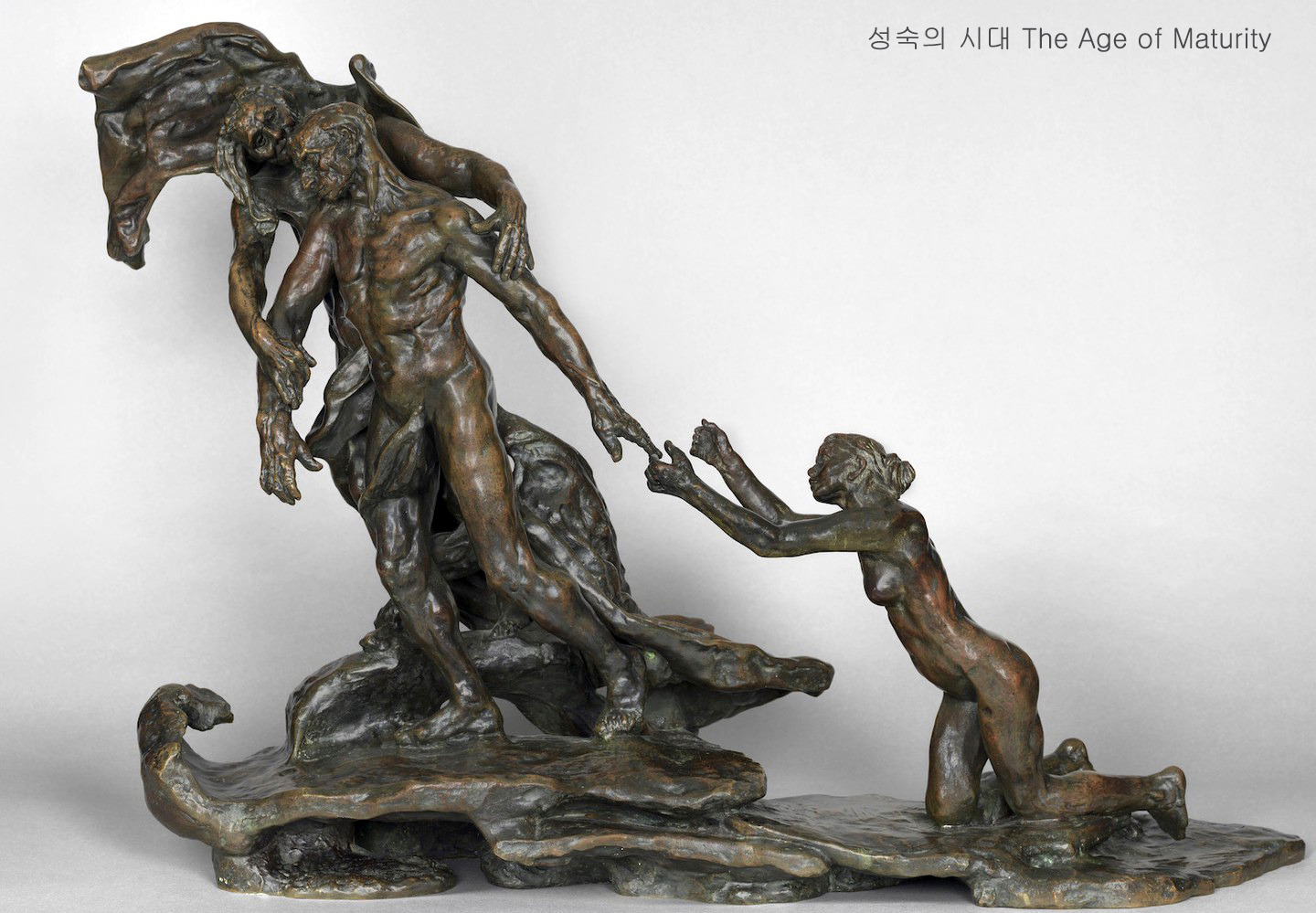클로델의 작품 "성숙의 시대"에서는, 젊은 여성이 무릎 꿇은 채 손을 뻗지만 노인은 노파에게 끌려가고 있습니다.