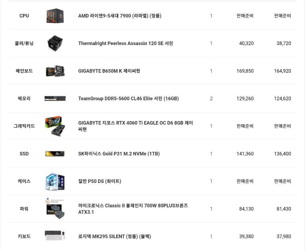 처음에는 14600KF로 견적 짜다가 인텔 이슈로 영 찜찜해서, 싱글이나 멀티 능력 비슷한 AMD CPU 찾던 중 7900이 눈에 들어왔습니다.