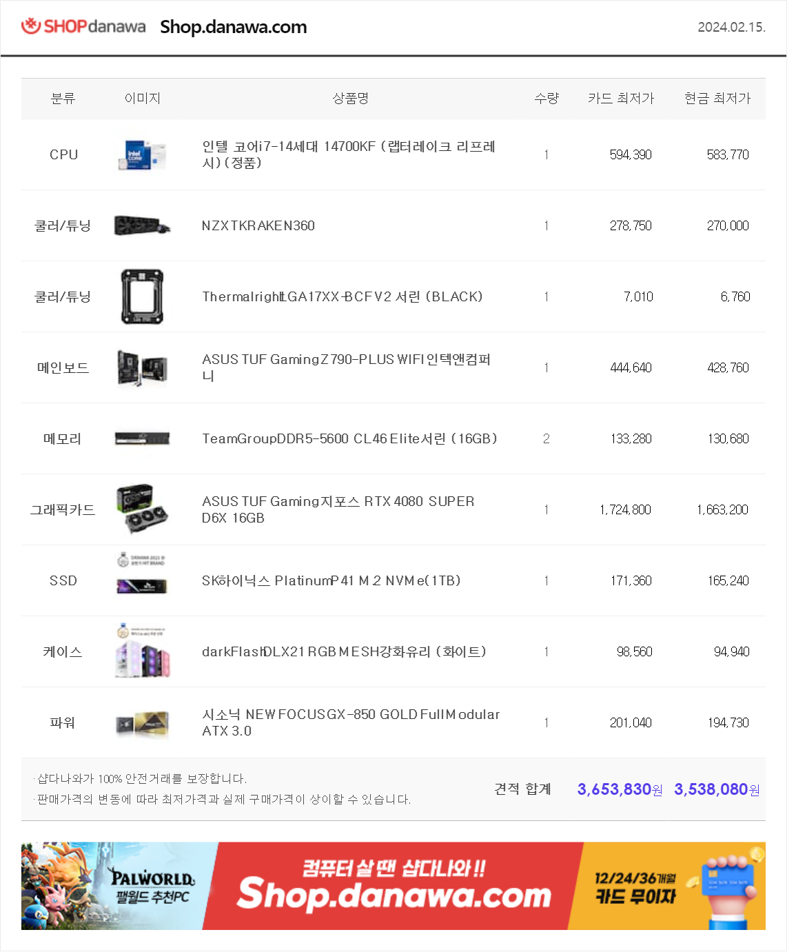 안녕하세요 아래견적으로 PC주문하여 어제 설치하였습니다.