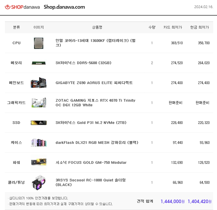 | 견적 조언 게시판입니다 이상증상에 대한 문의는 삼가해주시고 월간 견적 한번 참조하신뒤 짜오신 견적으로 물어봐주세요!! 1. 견적 예산액은 얼마이신가요? - 250 만원 (모니터 포함 최대 400) 2. 사용 용도를 자세히 알려주세요! - 게임 (게임종류 및 옵션) : 로스트아크, 스팀게임, FPS(APEX, 콜옵 등) - 작업 : 게임 개발(언리얼), 비주얼스튜디오 - 보조 : 유튜브 및 동영상감상 3. 사용 모니터 해상도 (FHD, QHD, UHD) -갯수 : UWQHD 1대, FHD 1대(오로지 FPS용) 4. 미리 만들어본 견적이 있다면 사양은? (사진으로 올릴경우 다운로드 파일로 올리지말고 직접볼수있게 올려주세요) 5. 추가사항 10년동안 컴퓨터 못 바꾸고 있다가 이번에 큰맘 먹고 바꾸려고 합니다. 이미 글카는 특가로 구매 했놨습니다. 발로란트 FHD 기준 540프레임 가능할까요? 부족할거 같다면 어떤 스펙을 높여야 할까요? 조언 부탁드립니다~! |