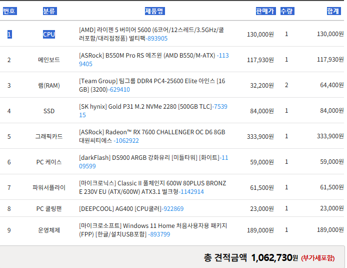 유튜브 12월 견적 열심히 보면서 따라 넣었습니다. 초기 예산은 윈도우포함 100만원 이하를 원했는데 많이 올라가네요..