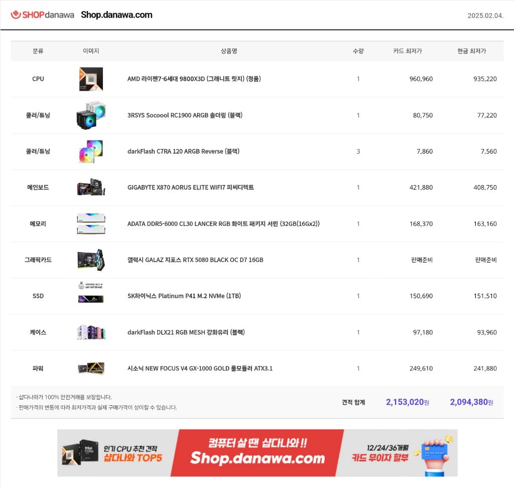 RE:98x3d 5080 견적 조언 좀 부탁드립니다. 작성자AIKA|작성시간25.02.04|조회수164 목록 댓글 2 글자크기 작게가 글자크기 크게가 말씀해주신 부분 수정해봤는데 이렇게 하면 될까요 ??메모리는 호환된다고 하네요 다음검색 현재 게시글 추가 기능 열기 북마크 공유하기 신고 센터로 신고 댓글 댓글 2 댓글쓰기 답글쓰기 댓글 리스트 작성자신성조 | 작성시간 25.02.04 넵 딱히 문제있는 부분은 없어보입니다 팬은 잘못고르신거 같은데 C6S 펜일겁니다 (2개만 사시면 됨) 답댓글 작성자AIKA 작성자 본인 여부 작성자 | 작성시간 25.02.04 아 펜을 3개 위치시키고 싶어 선택했습니다 감사합니다. 댓글 전체보기