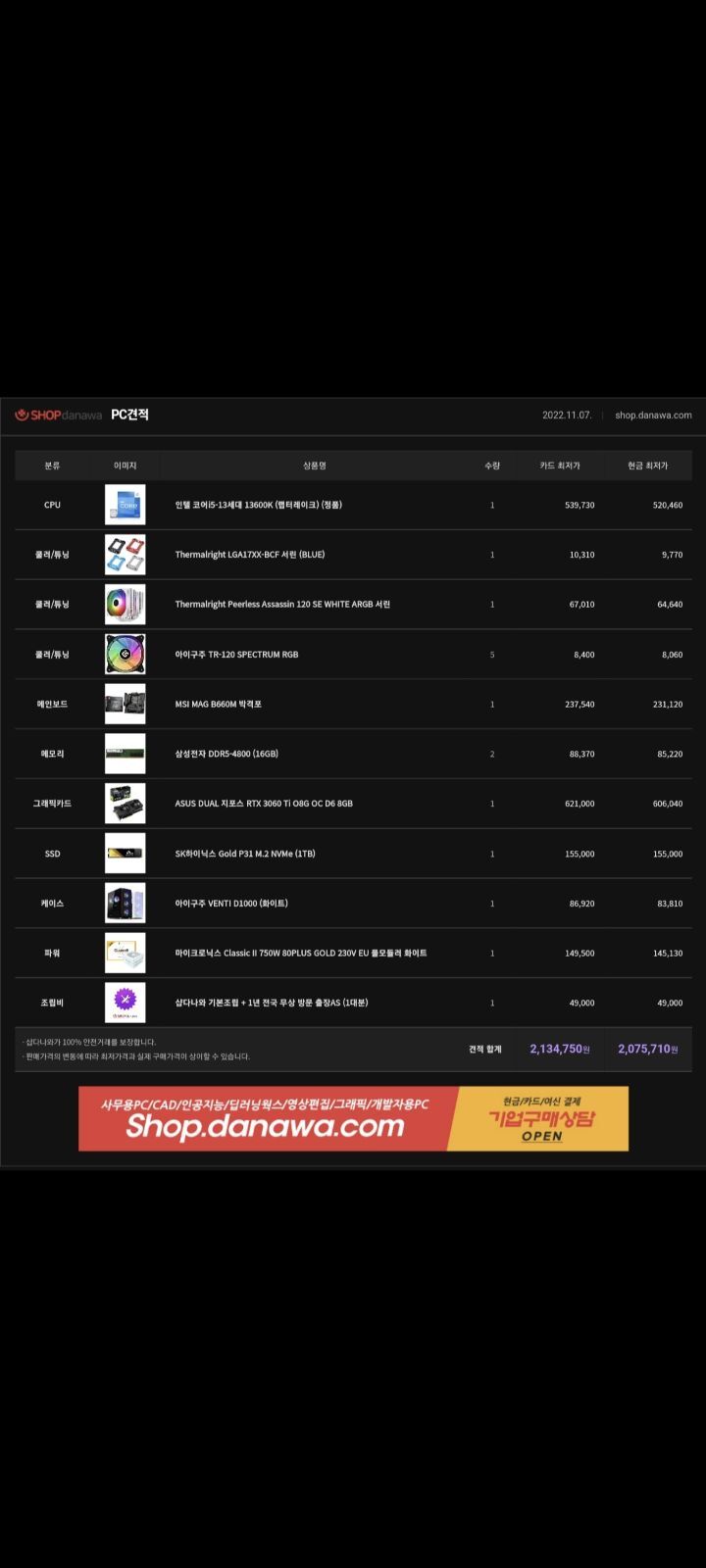 예전에 여기서 구매할때 견적 사진있네요 첨부할게요 ㅋ 팬이랑 방열판은 필요없다해서 뺐었어요