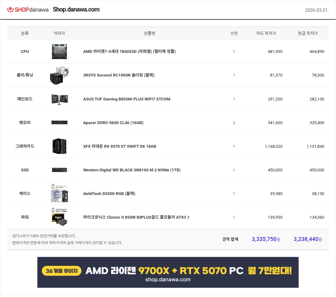 9800X3D + 16X2 메모리에 + 5070TI가 맞고 (저런 저품질 램 넣을 생각은 버리시고 월간견적 제품 중에 가세요 나중에 불량에 시달립니다)