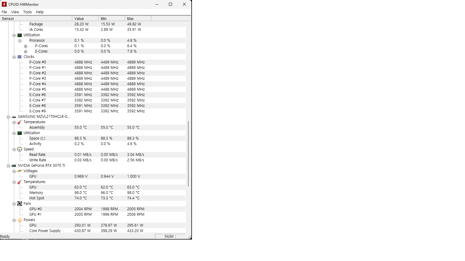 Re: 그래픽카드 팬과 온도 문의 작성자세레나데|작성시간23.03.22|조회수115 목록 댓글 2 글자크기 작게가 글자크기 크게가 지금 사항이에요~ 그럼 괜찮은가요 다음검색 현재 게시글 추가 기능 열기 북마크 공유하기 신고 센터로 신고 댓글 댓글 2 댓글쓰기 답글쓰기 댓글 리스트 작성자신성조 | 작성시간 23.03.22 gpu 63도면 착한거같아요 저게 한 80도 되면 좀 높은거구요 (핫스팟은 안보셔도됨) 답댓글 작성자세레나데 작성자 본인 여부 작성자 | 작성시간 23.03.22 음...지금까지 항상 40몇도 이리 나왓는데..겜하면 저리 올라가고요..아무것도 안하고 인터넷 하나 보고 잇는데..저 메모리 98도 이건 상관없는건가요?? 겜할때도 60도 전후던데...에궁 너무 과민반응인가 보네요 ㅋ 이런적은처음이라...감사합니다~ 댓글 전체보기