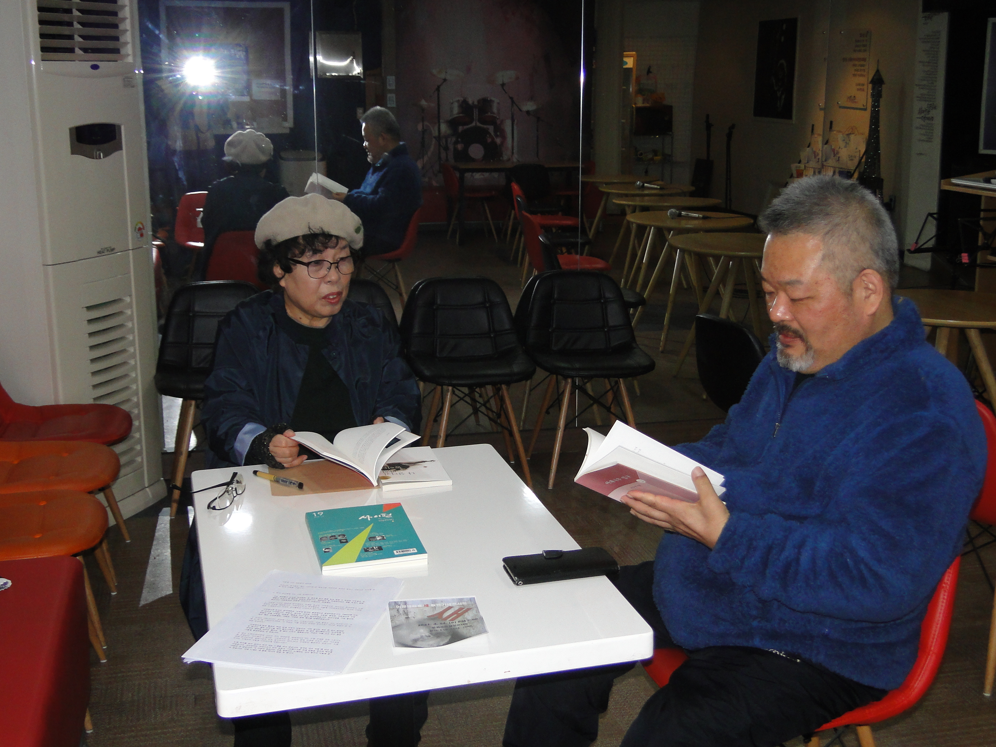 부산 대연동 ‘달빛콘서트’에서 진행한 사이펀 문학토크에 참석한 조선영, 이문영 시인