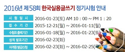 제58회 한국실용글쓰기 시험 일정안내(2016.1.23_토) 작성자실용글쓰기|작성시간12.06.02|조회수1,265 목록 댓글 4 글자크기 작게가 글자크기 크게가 다음검색 현재 게시글 추가 기능 열기 북마크 공유하기 신고 센터로 신고 댓글 댓글 4 댓글쓰기 답글쓰기 댓글 리스트 작성자이강토 | 작성시간 12.08.23 접수어디서하나여?ㅠㅠ 답댓글 작성자s터브가이s | 작성시간 13.09.25 접수는 국가공인 한국실용글쓰기자격시험 사이트에서 하시면됩니다. 작성자새미 | 작성시간 14.11.23 다음 시험은 언제 인가요? 작성자바다1231테크 | 작성시간 15.07.07 궁금하네여.정보많이얻겠습니다 댓글 전체보기