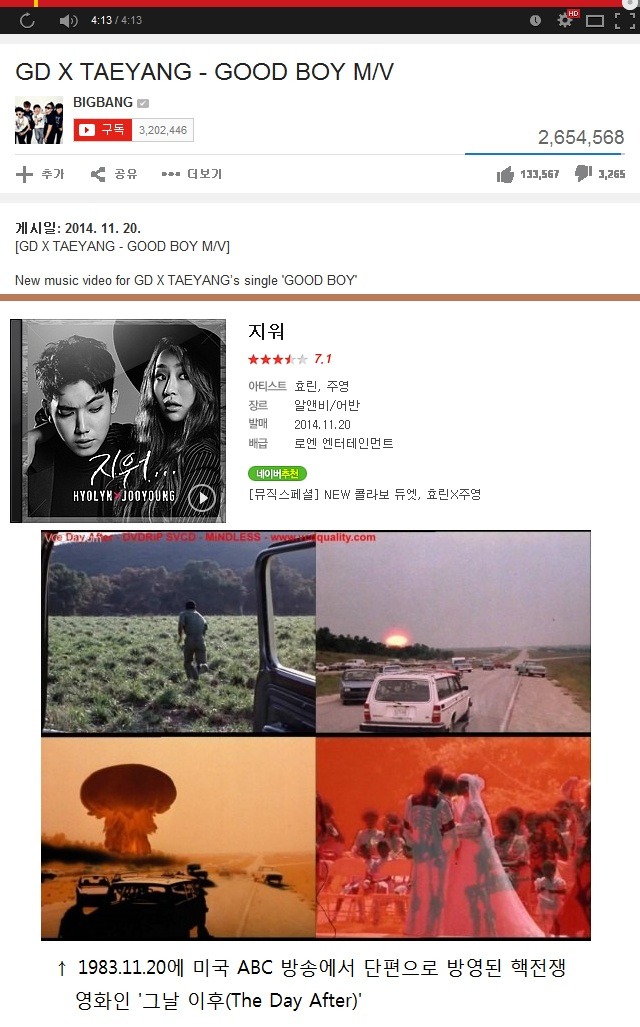 지드래곤 & 태양이 '굿보이' 뮤비를 게시한 날인 2014.11.20에는 효린 & 주영이 '지워' 앨범을 발매하기도 하였습니다.
