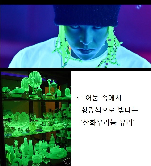 어둠 속에서 형광색으로 빛나는 것은, 핵폭탄의 원료가 되는 물질인 '우라늄[U]'의 산화물이 함유된 유리인 '산화우라늄 유리'의 특징입니다.
