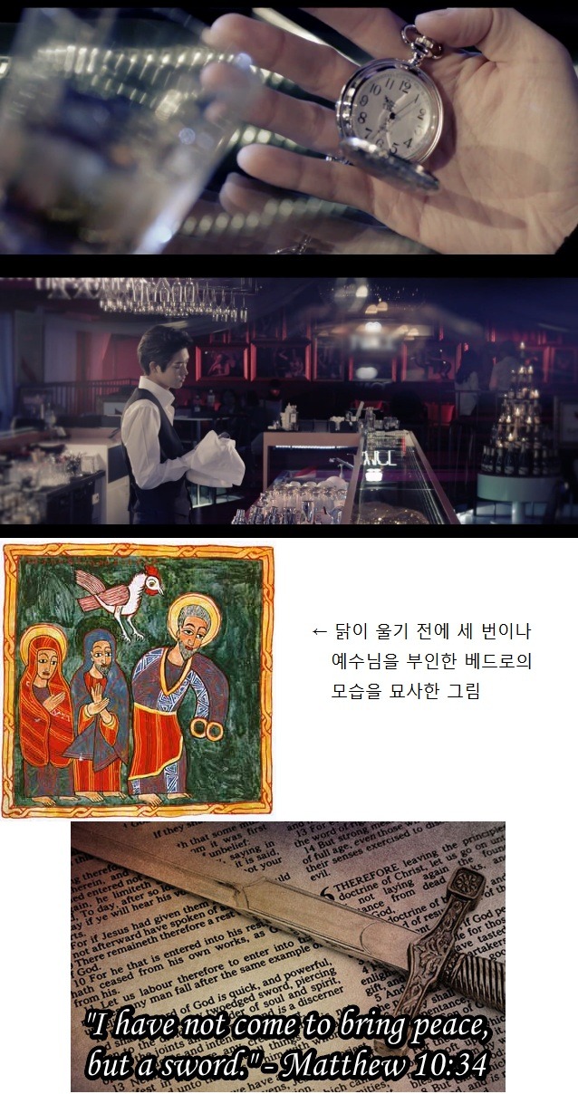 그러므로, 이 장면에서 나오는 시계는 마태복음 10장 34절 내용 "내가 세상에 화평을 주러 온 줄로 생각하지 말라 화평이 아니요 검을 주러 왔노라"를 암시할 목적인 것으로 풀이되며, 앞으로는 예수님을 믿으려면 불신자들과 더욱더 많은 갈등이 발생함을 감수해야 할 것이라는 암시인 것으로 풀이됩니다.