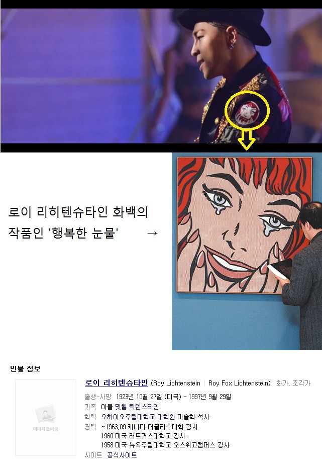 팔뚝에 '로이 리히텐슈타인' 화백의 작품인 '행복한 눈물'이 오버로크되어 있습니다.