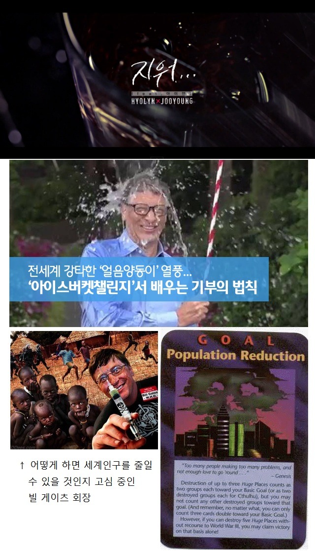 빌 게이츠 회장은 "백신이 세계 인구 감소를 도울 수 있을 것이다"라는 발언을 함으로써, 일루미나티의 인구 감축 어젠더를 노골적으로 암시한 인물입니다.