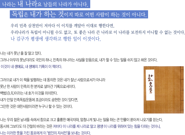 나는 살아서 고국에 돌아와 이 책을 출판할 것은 꿈도 꾸지 아니하였다. 나는 우리의 완전한 독립국가가 선 뒤 이것이 지나간 이야기로 동포들의 눈에 비춰지기를 원하였다. 그런데 행이라 할까 불행이라 할까, 아직 독립의 일은 이루지 못하고 내 죽지 못한 생명만 남아서 고국에 돌아와, 이 책을 동포의 앞에 내놓게 되니 실로 감개무량하다.