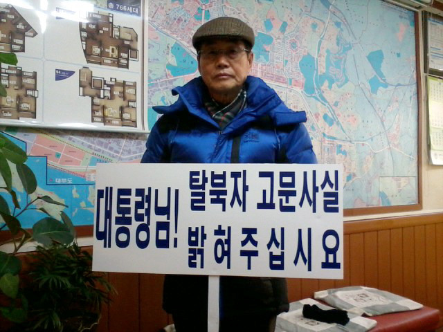 김 씨는 3일 오전 서울 종로구 청와대 분수대 앞에서 '대통령님, 탈북자 고문 사실 밝혀주십시오'라는 문구가 적힌 피켓을 들고 1인 시위를 벌였다.