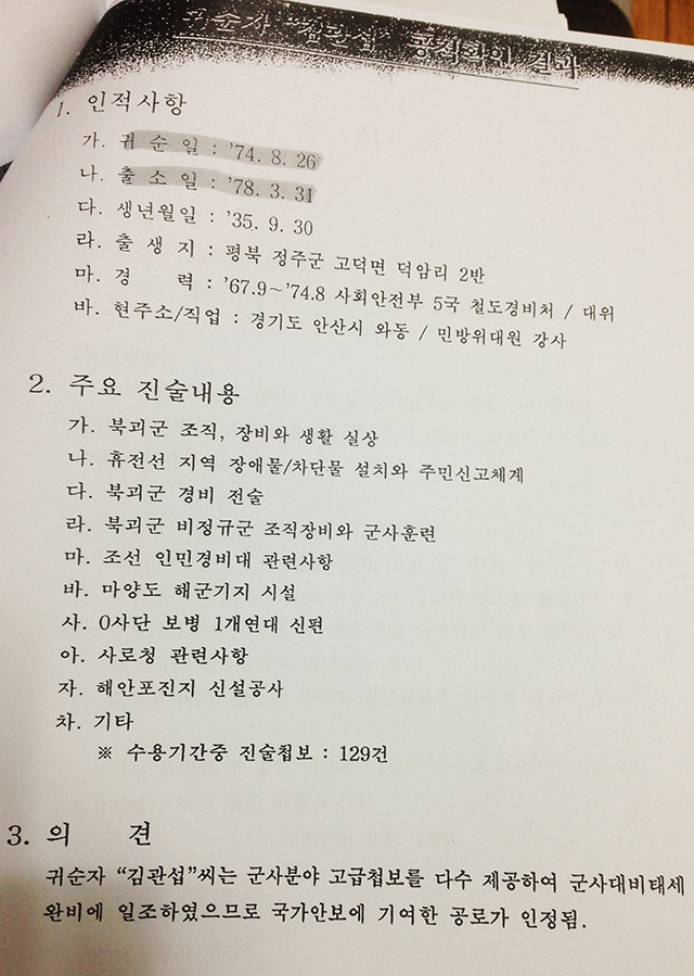 ▲김관섭 씨가 북한 이탈주민 후원회를 통해 받은 군 정보사령부의 귀순자 공적확인 결과 문서