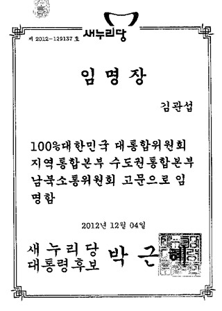 ▲지난 2012년 18대 대선 당시 김관섭 씨가 새누리당으로부터 받은 위촉장.