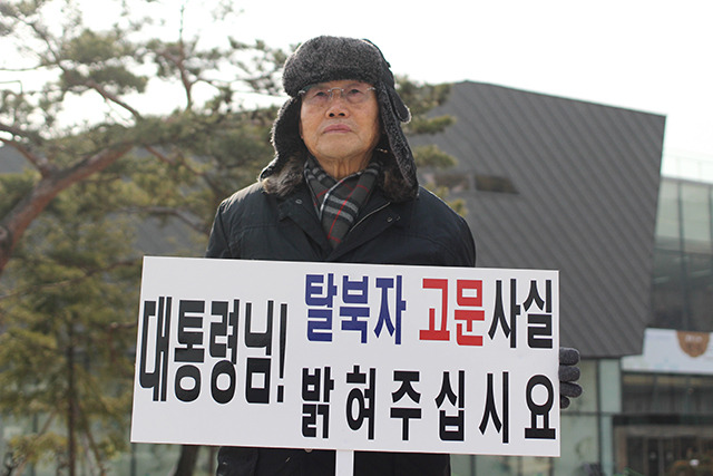 ▲'대성공사' 고문 피해자인 탈북자 김관섭 씨가 3일 오전 서울 종로구 청와대 분수대 앞에서 1인 시위를 열고 "고문 사실을 밝혀달라"고 요구했다