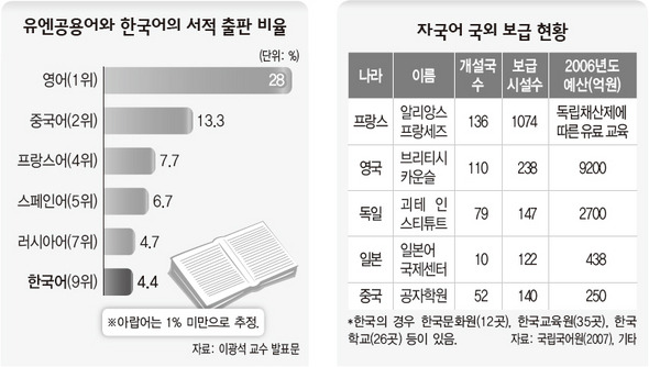 유엔공용어와 한국어의 서적 출판 비율 · 자국어 국외 보급 현황