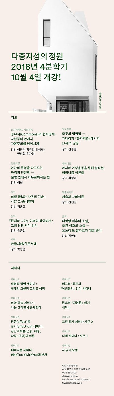 태그 : 다중지성의 정원, 다지원, 정치경제학, 사회운동, 정치철학, 인문교양, 페미니즘, 철학, 예술사회학, 문학, 서예, 공유지, 협력경제, 자본주의, Commons, 이광석, 황규환, 김상철, 권범철, 윤자형, 가타리, 분자혁명, 신승철, 인문학, 이인, 여성운동, 아시아, 여성주의, 최형미, 고중세철학, 김동규, 현대미술, 사회이론, 예술, 미학, 신현진, 존재의 시간, 하이데거, 윤동민, 코뮌, 발자크, 에밀 졸라, 장민성, 한글서예, 한문서예, 박찬순