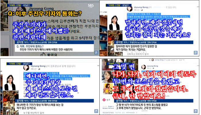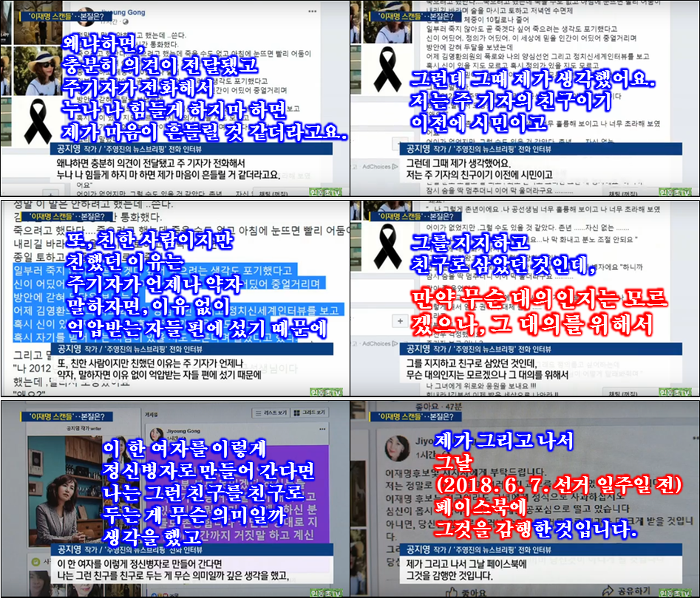 공지영 : 네, 멧세지를 줬어요. 그렇지만 어렵다고 봤어요. 왜냐하면, ‘그게 주진우가 혼자서 움직일 수 있는 건 아니겠다!’라고 생각했고, 개인적으로 그 포스팅 이후에 전화가 여러 번 왔었는데 받지 않았어요. 왜냐하면, 받으면 저도 흔들릴 것 같더라고요. 그래서 그냥 시간을 줬고, 그 이창윤씨가 폭로하겠다고 하길래, 제가 그냥 하라고 했어요. 그리고 이렇게 오늘에 이른 겁니다.