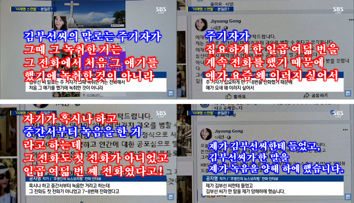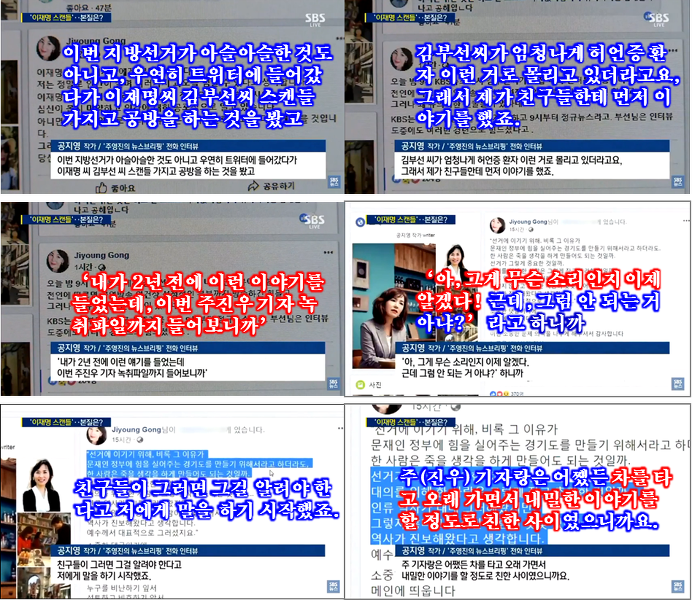 공지영 : 요약을 하자면, 그러니까 그 ‘김부선씨가 계속 그 허언증 환자 뭐 이렇게 되고, 이재명씨가 모함을 당하고 있다’라는 내용의 그 여러 가지 보도들을 보구요, 제가 2년 전에 들은 말이 생각이 나서 그것을 제가 그대로 전했죠.