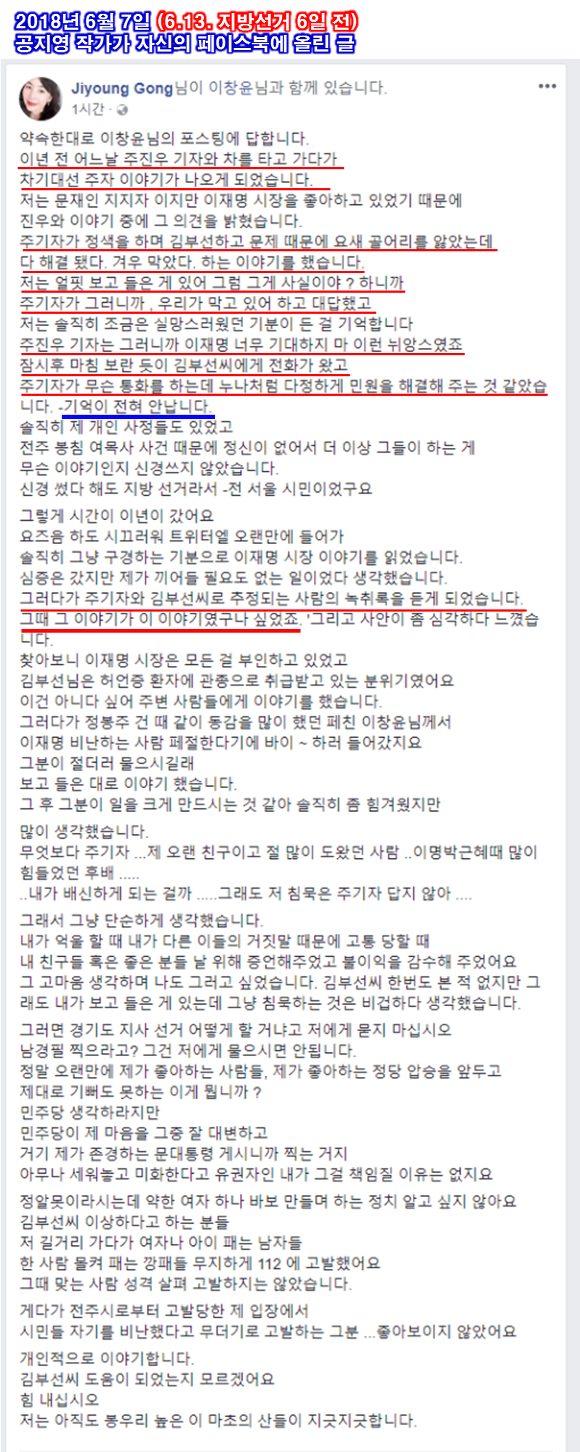 김영환 후보의 충격적인 기자회견이 있던 그날 6월 7일 공지영씨가 아래와 같이 자신의 페이스북에 장문의 글을 올려서 [이재명 김부선 이야기]를 더 뜨겁게 한 것입니다.
