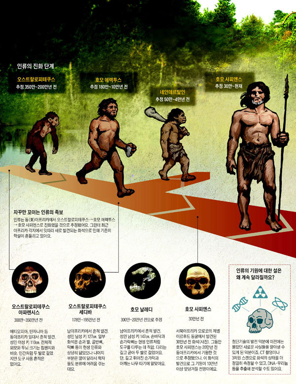 그동안 인류는 '오스트랄로피테쿠스→호모 에렉투스→호모 사피엔스' 순서로 진화했다고 알려졌어요. 점점 뇌 용량이 늘어나고, 손의 구조가 도구를 잘 다룰 수 있게 바뀌고, 몸집이 커지고, 턱이 작아지고, 다리와 발이 걷고 달리는 데 적합하게 바뀌었다고 본 것이죠. 그러나 최근 잇따라 발견된 원시 인류 화석은 기존 가설을 뒤집고 있어요.