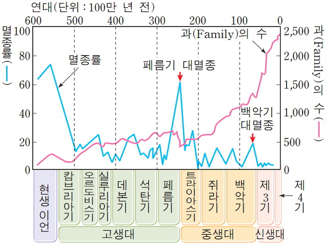 대멸종 : 대규모의 지각 변동에 따른 대륙 이동과 천재지변, 소행성의 충돌 등 다양한 요인에 의해 생물 종의 상당수가 갑자기 사라졌다.