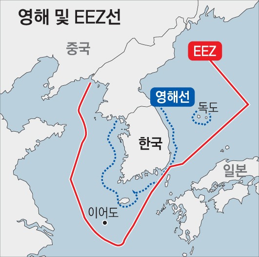 한국, 일본, 중국이 각각 주장하는 배타적 경제수역(EEZ)
