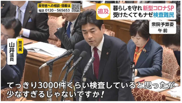 야마노이 · 무소속 의원 :"나는 당연히 하루 3000개 정도 검사되고 있을 거라고 생각 했는디. 너무 적은거 아녀?"