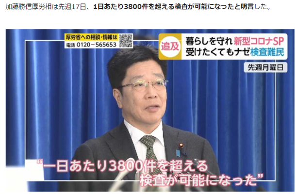 [기사번역]가토 후생성(보건복지부)장관이 2월17일 월요일 하루평균 3800건 검사가능하게 됬다고 대놓고 뻥침.