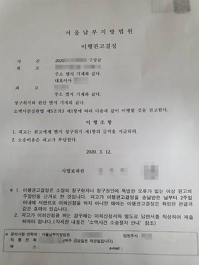 한 변호사에 따르면 소액사건의 경우엔 결정문을 받은 날로부터 14일 이내에 이의신청을 하지 않으면 확정된다. 무조건 이의신청서를 내야 한다는 얘기다. 이의신청서를 내 소송을 제기하면 위 이행권고결정에 대해 원고의 청구를 기각하고 소송비용은 원고의 부담으로 한다는 재판을 하게 된다.