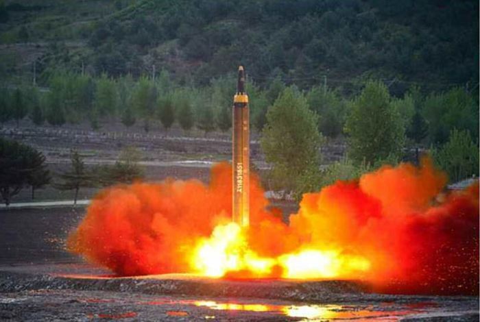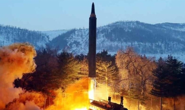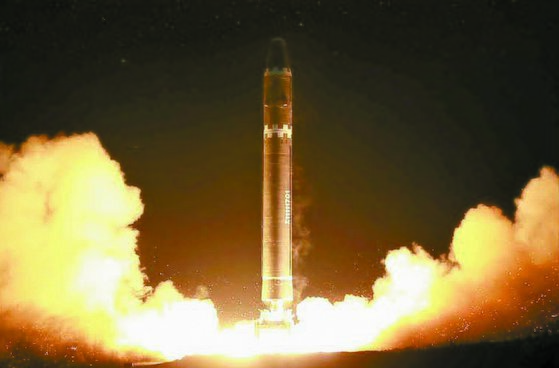지난 2017년 11월 29일 북한이 공개한 신형 대륙간탄도미사일(ICBM) '화성-15형' 시험발사 모습. 연합뉴스