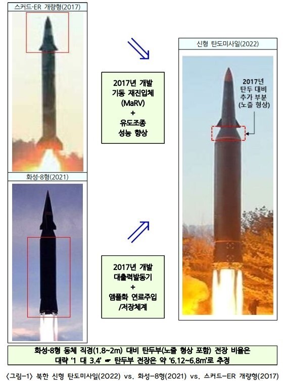 그는 "신형 탄도미사일에 탑재된 탄두부는 외부 형상·성능 등에서 진정한 의미의 극초음속 활공체라기보다 기존 대비 대폭 성능 향상된 기동 재진입체(Improved MaRV)로 보는 것이 좀 더 합리적"이라고 지적했다.