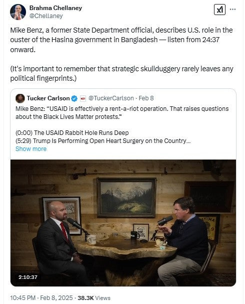 이번 달 초 전 국무부 관리인 마이크 벤츠는 터커 칼슨과의 인터뷰에서 하시나가 해당 지역의 미군 기지에 반대했기 때문에 작년에 방글라데시의 정권 교체에 USAID가 자금을 지원했다고 주장했습니다.