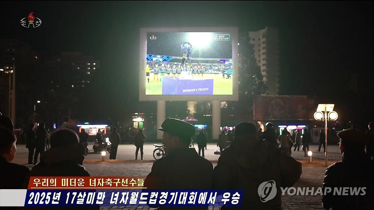 (서울=연합뉴스) 북한 조선중앙TV는 지난 9일(한국시간) 모로코 라바트에서 열린 2025 국제축구연맹(FIFA) U-17 여자월드컵 결승 경기를 11일 중계했다. 사진은 북한 주민들이 시내 대형전광판과 TV로 결승 경기를 관람하고 있다. 북한은 네덜란드를 상대로 3-0 대승을 거두고 정상에 올랐다.[조선중앙TV 화면] 2025.11.11 [국내에서만 사용가능. 재배포 금지. For Use Only in the Republic of Korea. No Redistribution] nkphoto@yna.co.kr