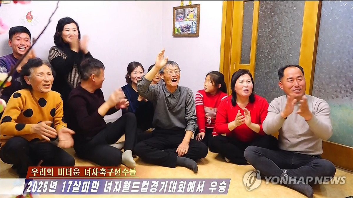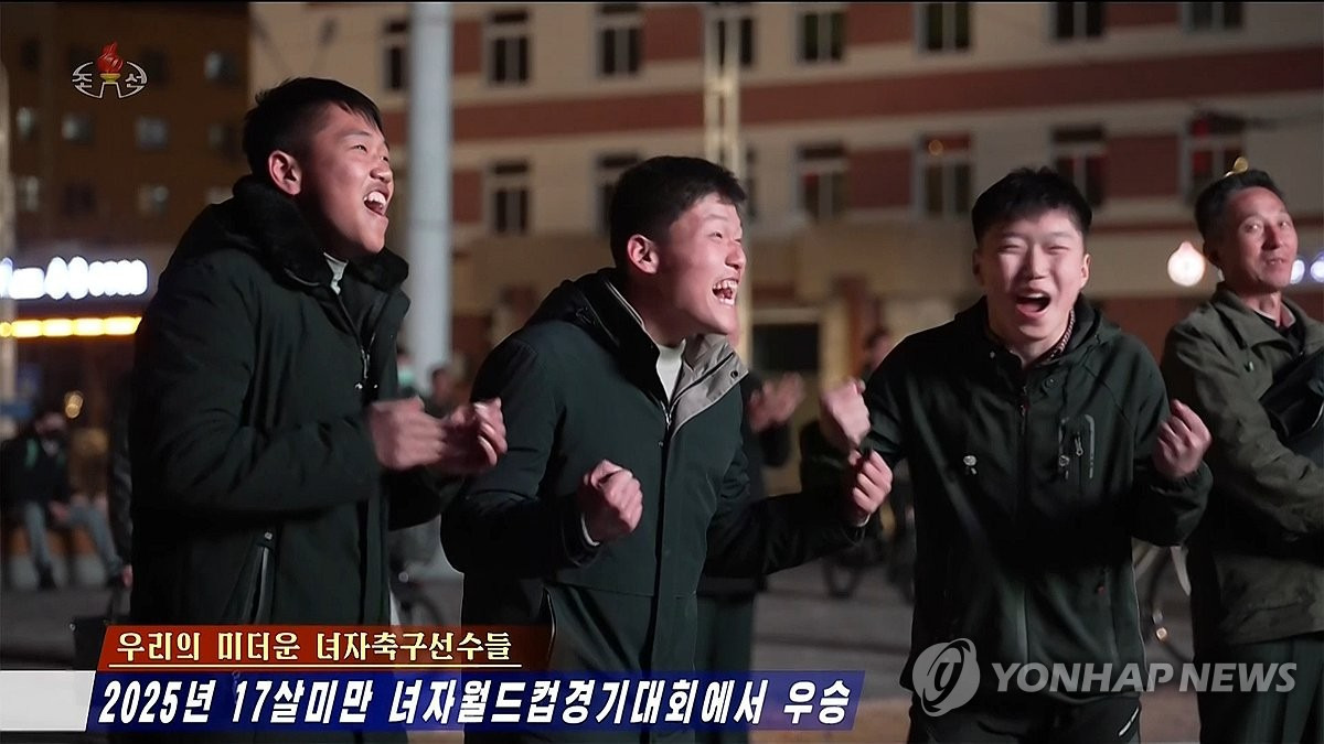(서울=연합뉴스) 북한 조선중앙TV는 지난 9일(한국시간) 모로코 라바트에서 열린 2025 국제축구연맹(FIFA) U-17 여자월드컵 결승 경기를 11일 중계했다. 사진은 북한 주민들이 시내 대형전광판과 TV로 결승 경기를 관람하다 선수들이 골을 넣자 환호하고 있다. 북한은 네덜란드를 상대로 3-0 대승을 거두고 정상에 올랐다.[조선중앙TV 화면] 2025.11.11 [국내에서만 사용가능. 재배포 금지. For Use Only in the Republic of Korea. No Redistribution] nkphoto@yna.co.kr