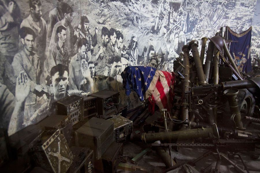 3월 9일 평양의 전쟁박물관, 유리벽안에 미국기와 각종 무기들이 진열되어 있다.