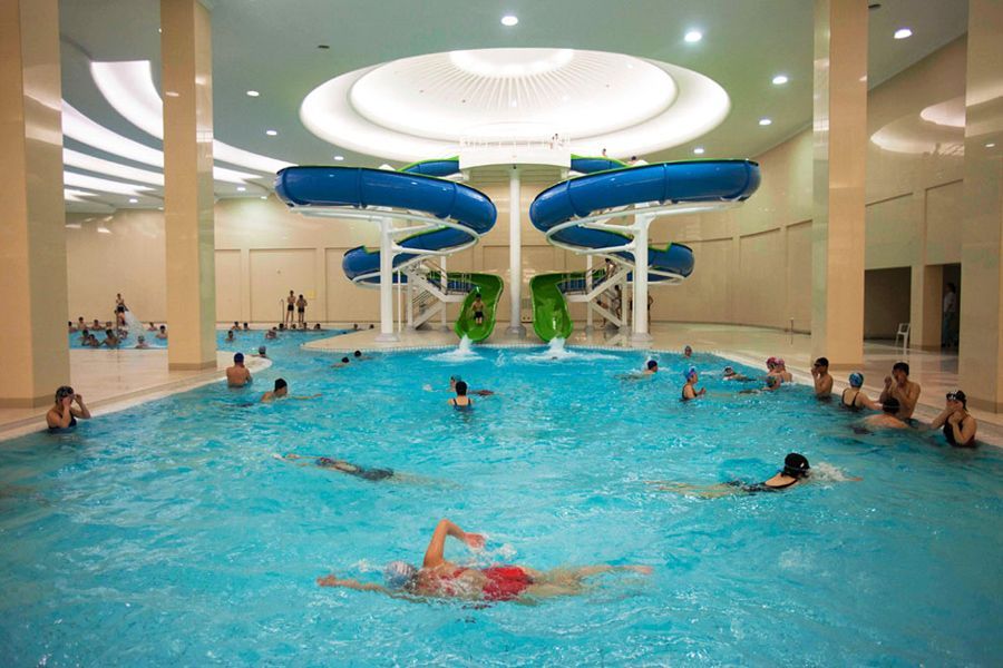 4월 13일 김일성 종합 대학 내에 있는 수영장, 학생들이 수영을 하고 있는 모습
