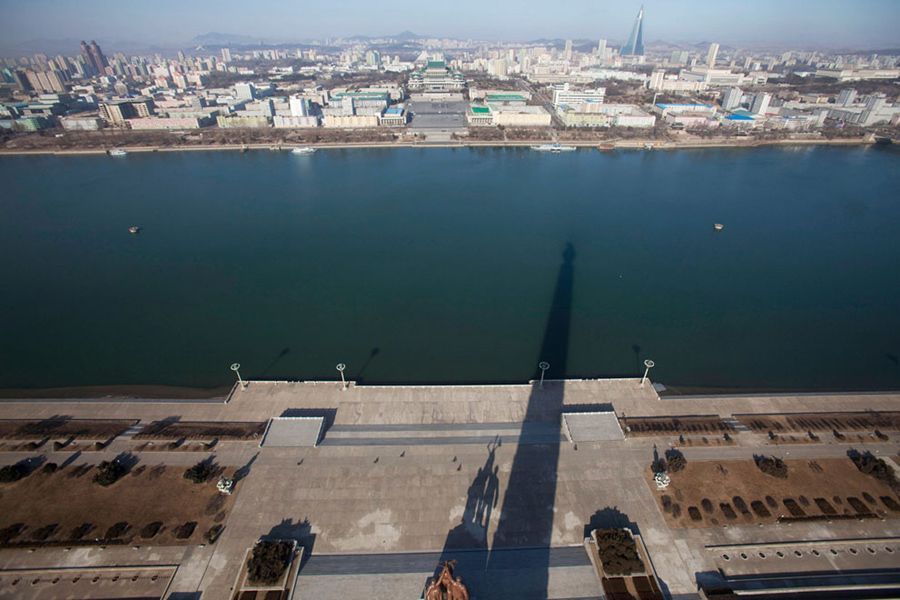 3월 9일, 평양의 대동강변, 저녁 햇살에 주체 사상탑이 대동강변에 그림자를 만들고 있다.
