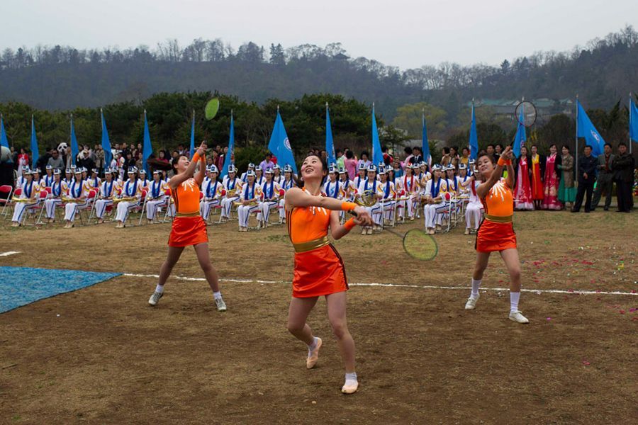 4월 15일 평양의 한 공원에서 김일성 탄생 경축일에 여자 배우들이 배드민턴 춤을 추고 있다.