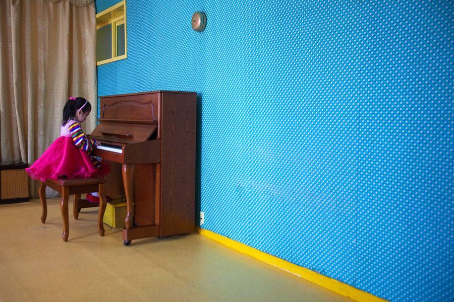 3월 9일 평양의 한 초등학교, 한 아이가 피아노를 치고 있다.