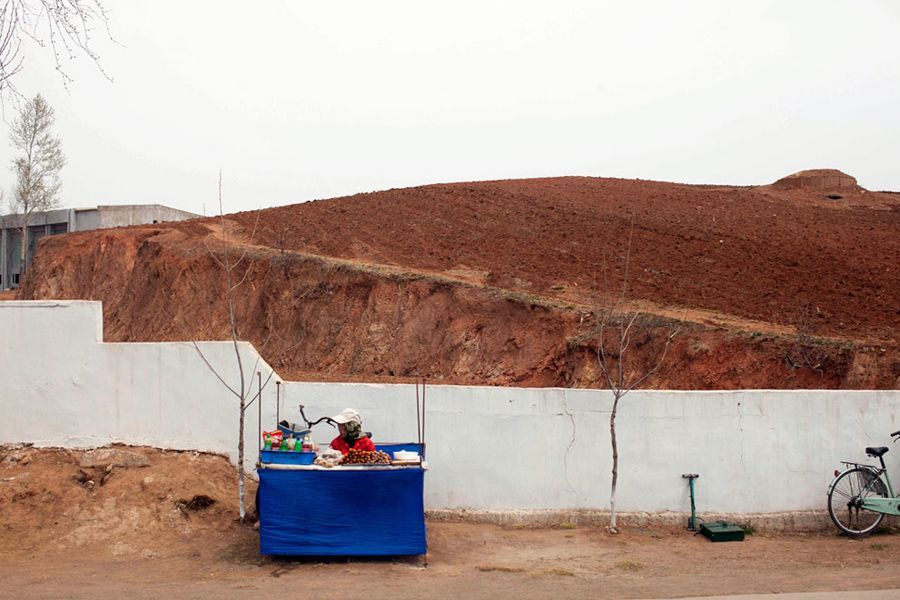 4월 21일 , 남포 서해 갑문 입구에서 한 여자가 점포를 차리고 먹을 것을 팔고 있다.