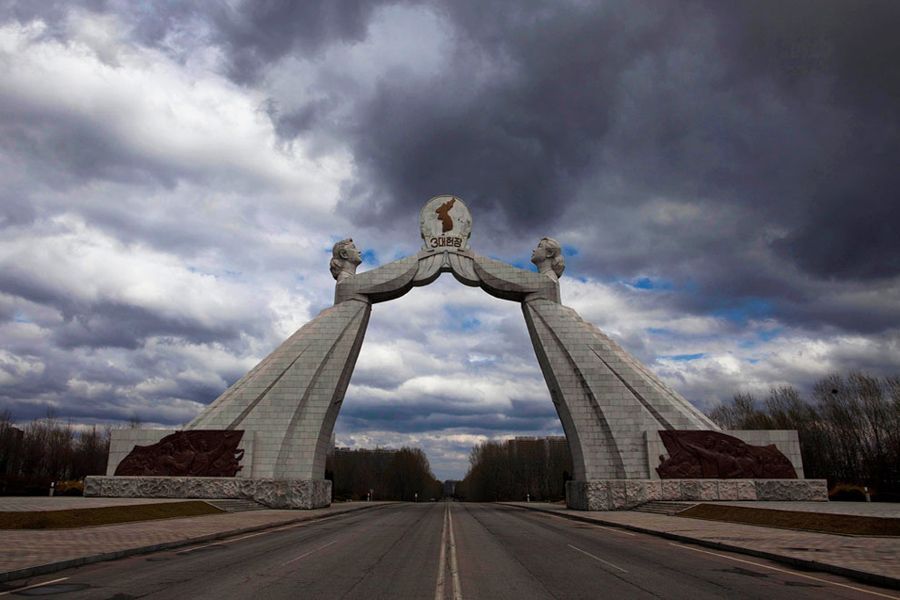 4월 18일 평양 근교의 조국통일 3대 헌장 기념비,이 기념비는 조선과 한국의 통일 염원을 상징한다.