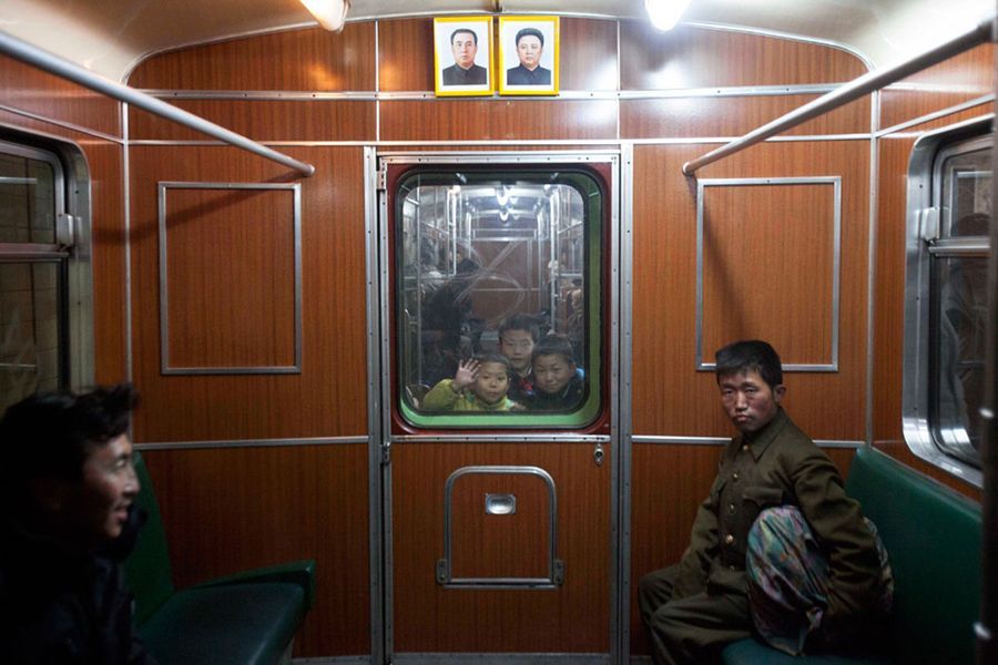 3월 10일 평양의 지하철 내부, 어린아이들이 창으로 이쪽을 쳐다보고 있다.